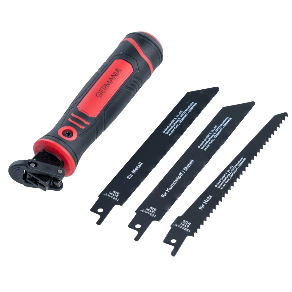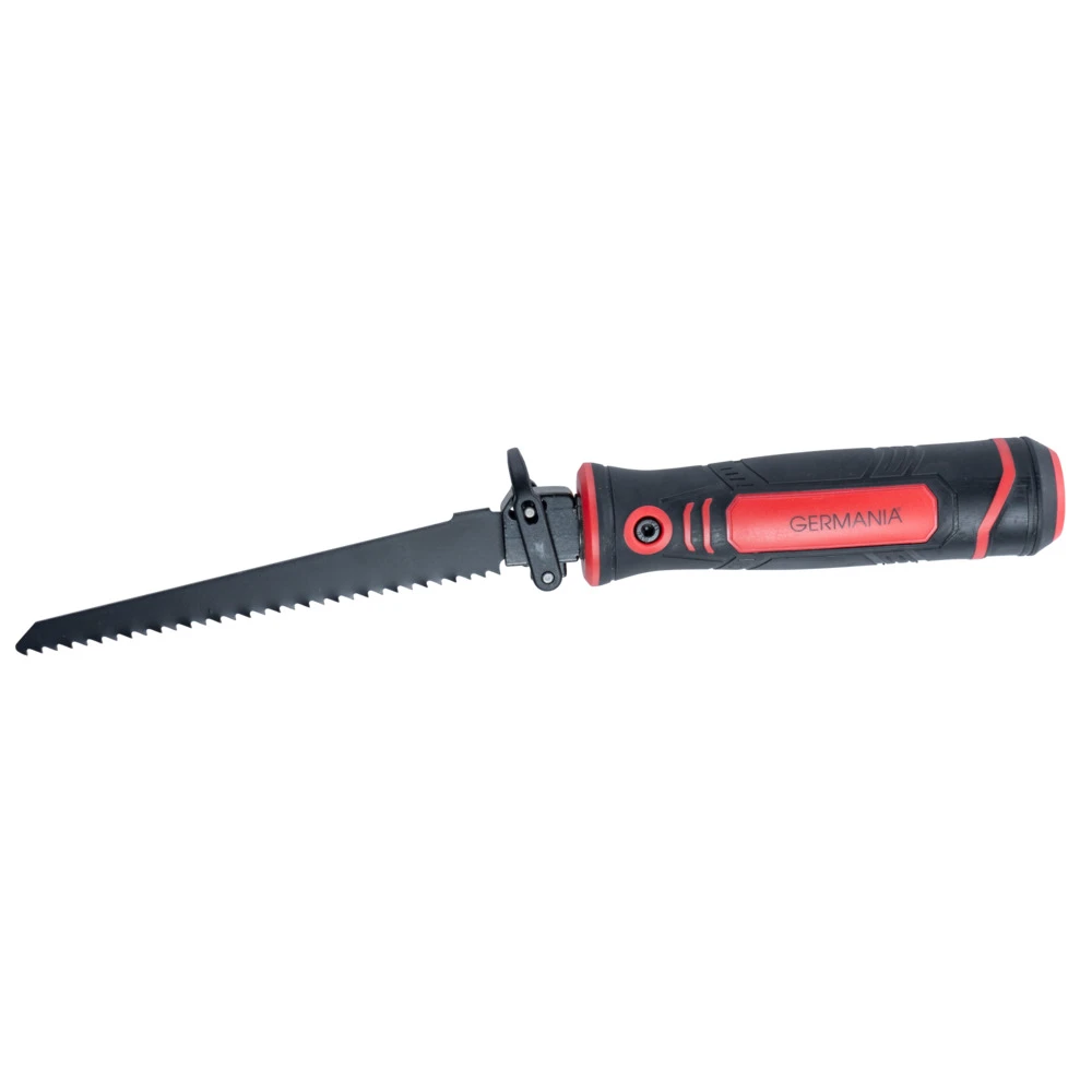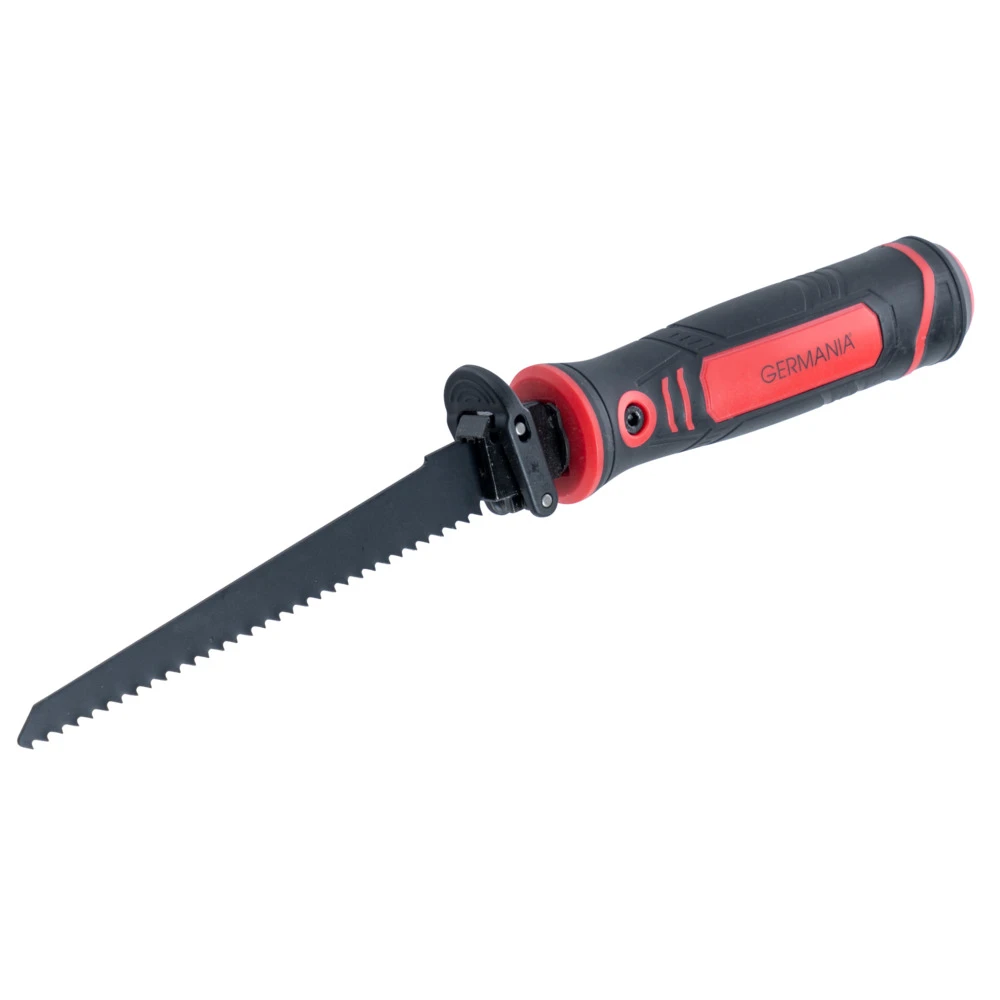 Die Handsäge von GERMANIA® eignet sich mit ihren drei unterschiedlichen Sägeblättern zum Schneiden von Holz, Kunststoff oder Metallen. Dank der Schnellverschlussfunktion am Griff lässt sich das Sägeblatt schnell und unkompliziert wechseln. Dabei können verschiedenste Säbelsäge- und T-Schaft-Stichsägeblätter verwendet werden. Der rutschfeste Handgriff bietet sicheren Halt und verhindert ungewolltes Abrutschen. Egal ob es um allgemeine Holzarbeiten, feine Schnitte oder das Schneiden von Kunststoffen und Metallen geht, die Handsäge ist vielseitig einsetzbar. Die mitgelieferte Plastikbox erleichtert die Aufbewahrung der Sägeblätter.